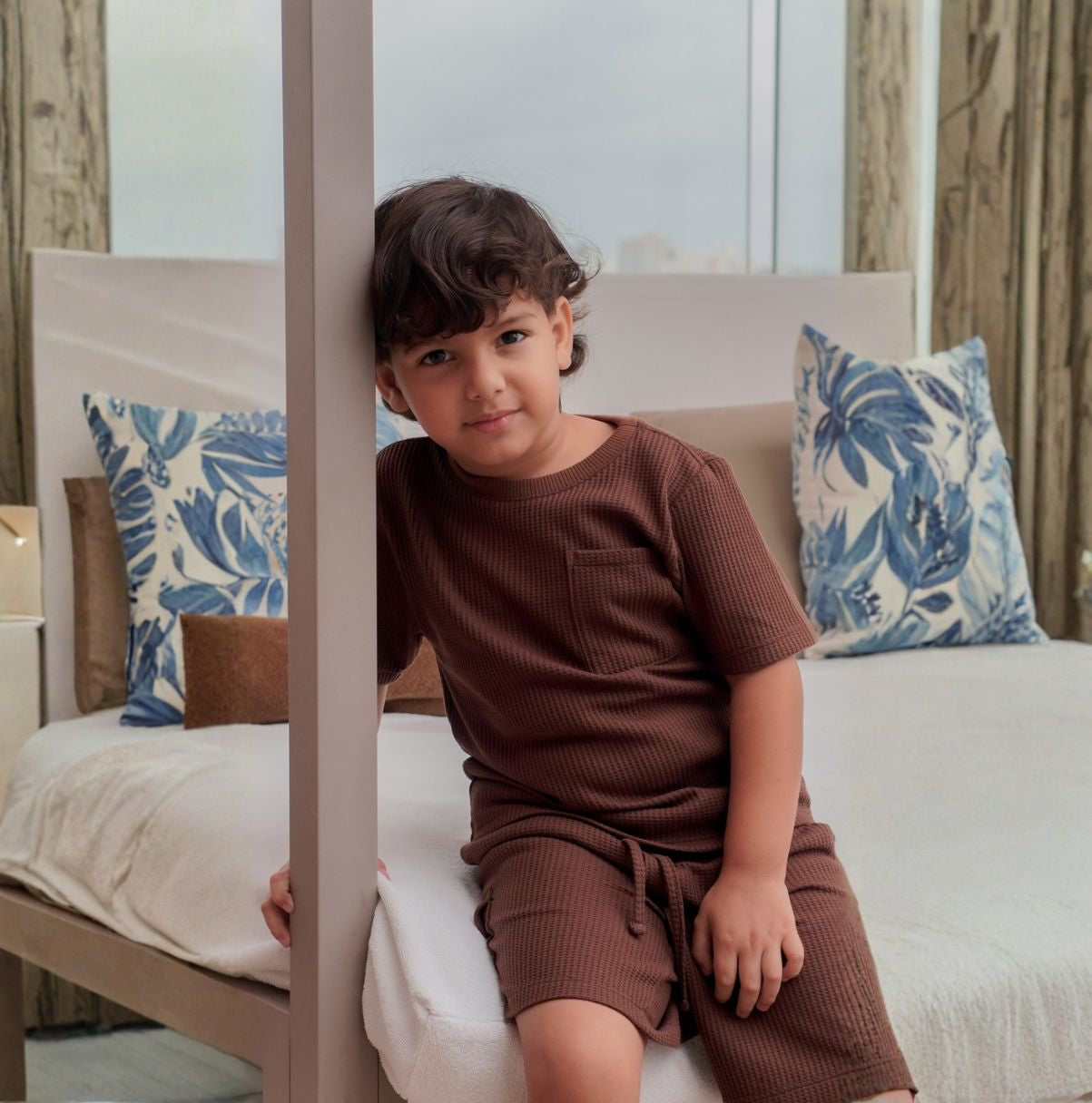Bermuda tipo galleta oversize con cordón ajustable, Cuenta con bolsillos en la parte delantera y laterales tipo cargo, y un cordón en la cintura que permite un ajuste cómodo. Su textura tipo galleta y corte oversize ofrecen libertad de movimiento y un look moderno, perfecto para los días de juego y descanso.